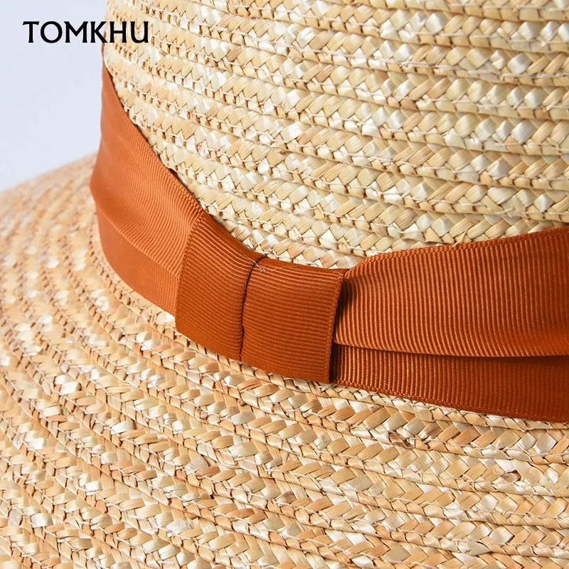 Wide Brim Boater Sun Hat Straw Hat Flat Women Summer Kentucky Derby Hat Orange Black Ribbon Tie Sun Hat Beach Casual Cap Handmad